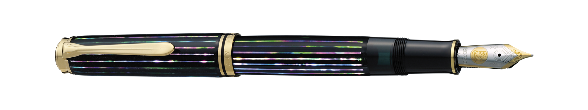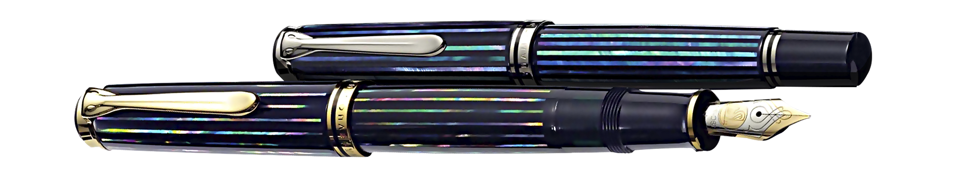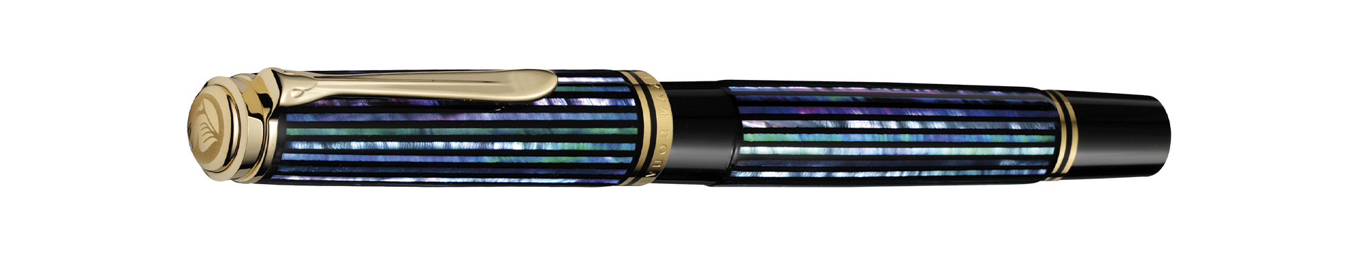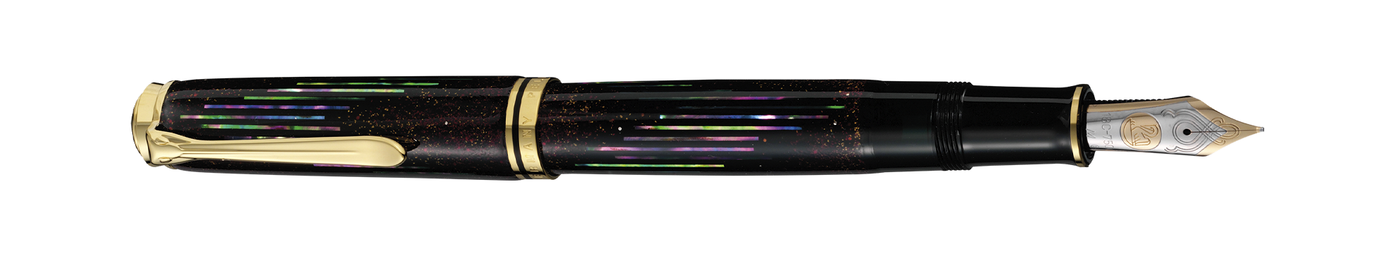 The Pelikan logos are drawn with the famous Maki-e technique, surrounded by matching colors of particles of the abalone shell.