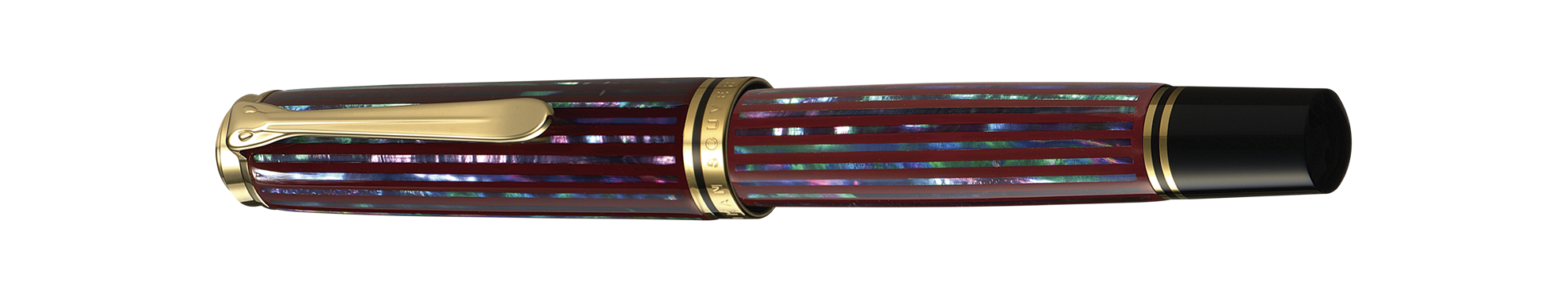 The fountain pen M1000 Raden Sunrise red is first painted in a deep red color, using the special Japanese Urushi lacquer. Then the colorful stripes are made with particles from the abalone shell, which originates in the Japanese Sea. In the production process, the shell is placed on the ground and flattened with a hard stone into very thin sheets. These sheets are cut into narrow strips and then affixed to the coating of lacquer around the cap and the barrel of the fountain pen. Afterward, the pen is once again coated with lacquer, and then the surface is polished.