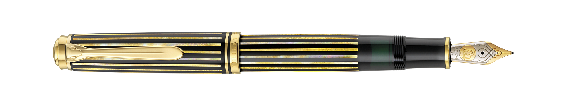 The Pelikan logos are drawn with the famous Maki-e technique, surrounded by matching colors of particles of the abalone shell.