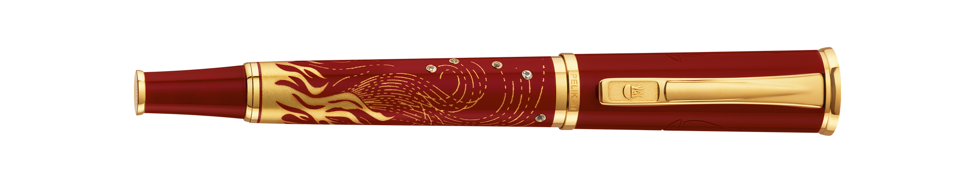 The barrel is made of brass and lacquered several times in a vivid red. Every flame on the barrel is first lasered, then plated with 24-carat gold. Five real Topaz gemstones make the sparks come alive. The nib is made of 18 carat/750 gold and has an iridium grain at the tip. This Limited Edition is available in the nib sizes F, M, and B. When burning wood, our forefathers learned to produce embers hotter than 500° Celsius (900° Fahrenheit) that were valuable for their survival.