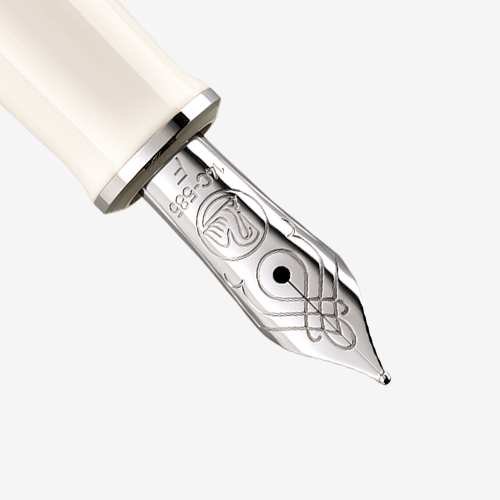 The Souverän M405 Silver-White fountain pen with differential piston mechanism has a 14-carat/585 completely rhodium-plated gold nib. The matching ballpoint pen is available with push-button mechanism.